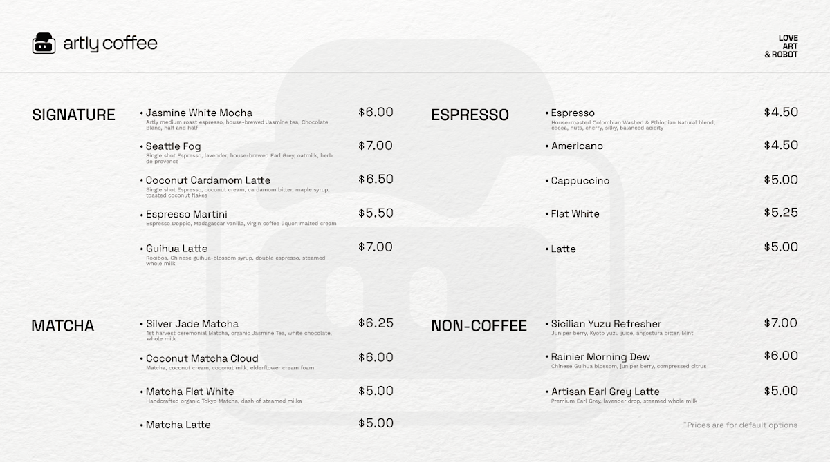 Artly Robot Coffee - Seattle's Robot Cafe Menu